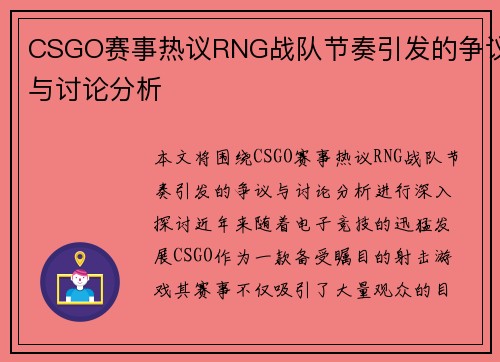 CSGO赛事热议RNG战队节奏引发的争议与讨论分析